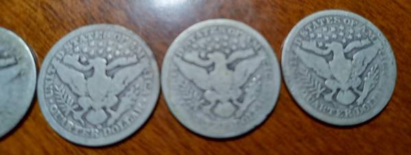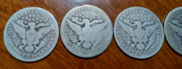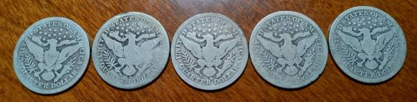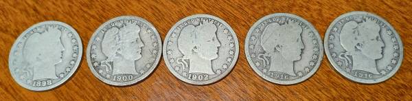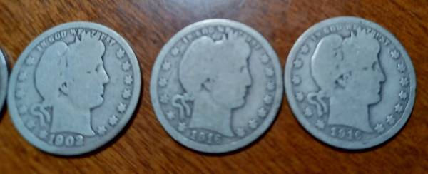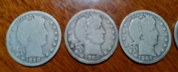 5 very old silver Morgan Head quarter dollar coins All coins are in very good condition for their age. Some coins are in better condition than others. From left to right 1898, 1900 O, 1902 O, 1916...