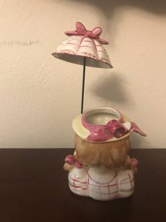 This 1960's Umbrella Girl Head Vase was made by Royal Sealy in Japan. The porcelain head vase features a cute girl with blonde pig tails, pink gingham dress, boat hat and holding a matching umbrella. The head stands 4 1/2" tall and 4' wide. It's approximately 8' tall with the umbrella.