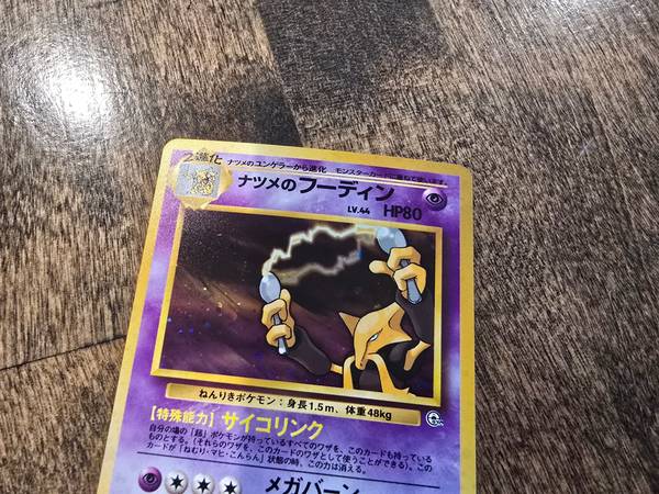 1996 Japanese Pokemon Sabrinas Alakazam #065 Trading Card for $12/firm. It's bowed as pictured from being in a binder. Other than that, it's in good condition.