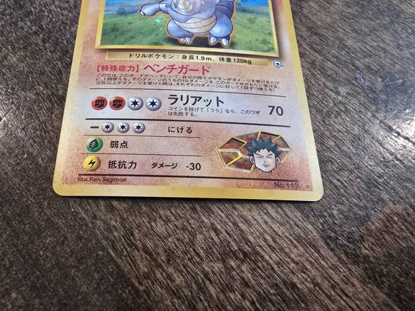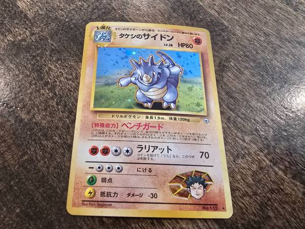 1996 Japanese Pokemon Brock's Rhydon #112 Holo Trading Card for $10/firm. It's bowed as pictured from being in a binder, and has a blemish on the back edges.