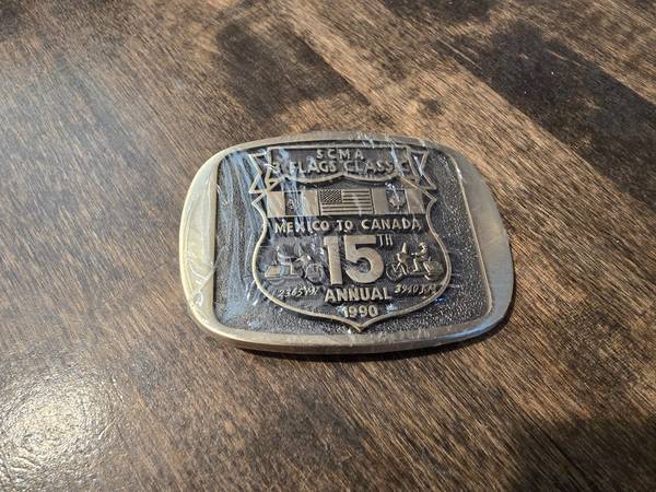 New 1992 Three 3 Flags Classic Mexico To Canada Motorcycle Brass Belt Buckle for $25. Measures about 4" x 2". New 1994 Three 3 Flags Classic Mexico To Canada Motorcycle Brass Belt Buckle for $25....