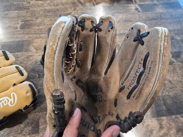 Rawlings Youth Playmaker WPM115NC 11.5" & Mizuno Power Close 10" Baseball Glove Mitt for $10/both. Not selling separately. They both have some flaws at pictured. The Rawlings is coming undone. The Mizuno has a broken tie and has a name on the side.