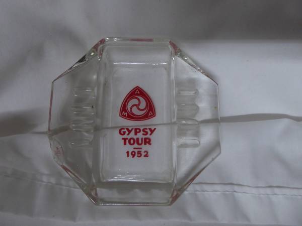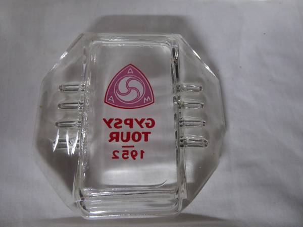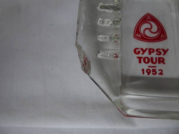 This is a 1952 dated AMA (American Motorcycle Association) Gypsy Tour clear glass ashtray. It measures 5" by 5". Safex brand. One corner is chipped. Chip measures 1" x 3/8". Printing on ashtray is not damaged. $40. It is in Penryn. Call show contact info