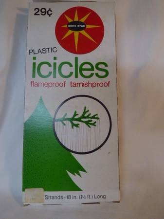 4. NIB Brite Star plastic icicles. Flame proof/tarnish proof. 150 strands. 18" long. Made in USA. Box a bit mashed. $2.