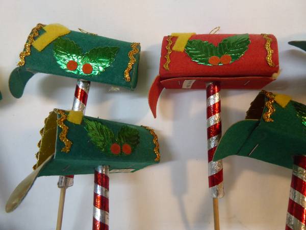 2. 8 Cardboard mail boxes on candycane stripe-covered wood picks. Made in Japan. 4 1/2" tall, 2" long. 6 green, 2 red with flocked cardboard, foil holly leaves, yellow mailbox flag. $10 for all 8.