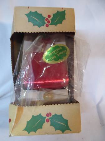 9. Large, Red Satin Sheen Bell Ornament. Non-glass. Original box which is somewhat mashed. Pyramid Mills Co., Inc. Bessemer City, NC. Item 250/S. Bell is 4 1/2" long. No UPC code on box. $10.