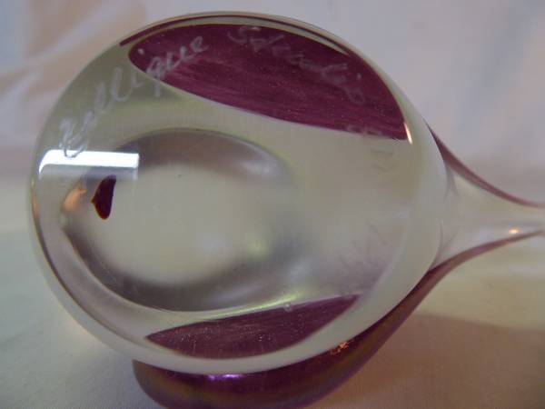 2. Zellique Studios dark pink winged bird. Body of bird is frosted glass. Signed JM (Joseph Morel) 1992. Has pink heart inside. 4 1/2" long, 3" tall. No damage.