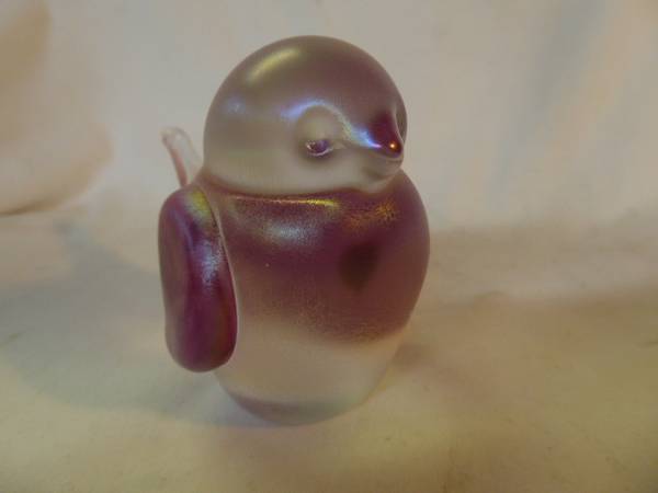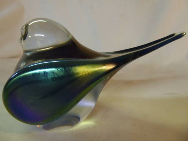 1. Iridescent blue winged clear glass bird dated 1982. Bumps to simulate ruffled down on breast of figurine. Signed Zellique 1982 on bottom. 4 1/2" long, 3" tall. No damage. $25.
