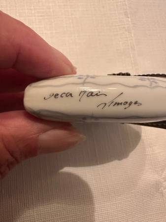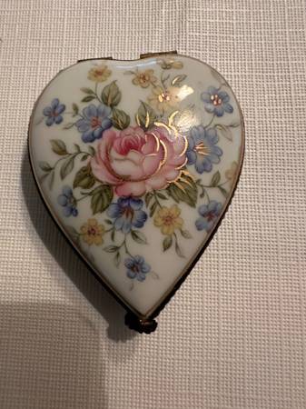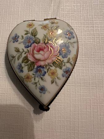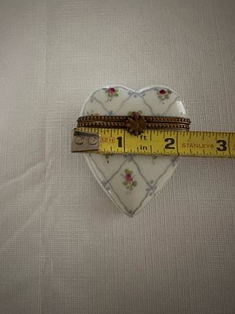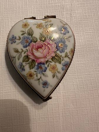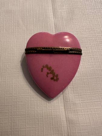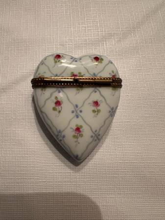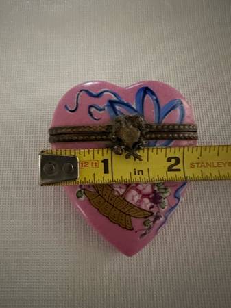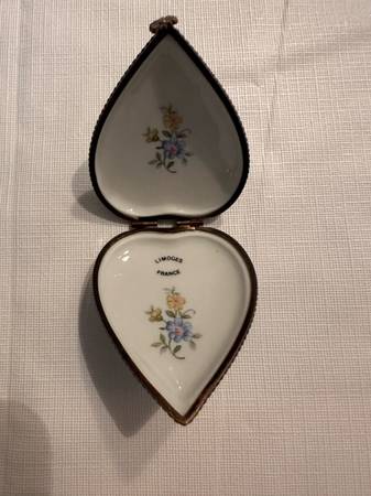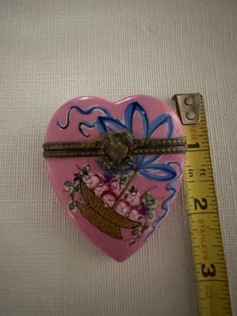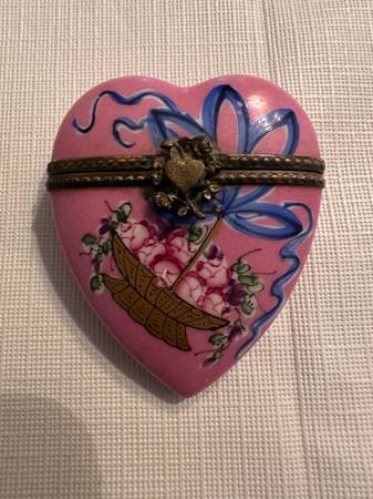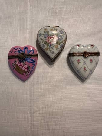 Three beautiful Limoges heart shaped trinket boxes . Pink and blue Rochard $95. Blue and large pink flowers with gold detailing on front and back and inside $50.00 Tulips decorate this heart with blue trellis, lovely $60.00. Local meet up and cash only