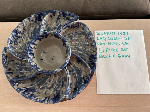 Sunkist Pottery Co Van Nuys CA Similar item can be seen on EBay selling for $55-$65 5 Piece Set : 4 pieces of Blue & Gray Servers that sit on a round base that rotates (called a Lazy Susan)