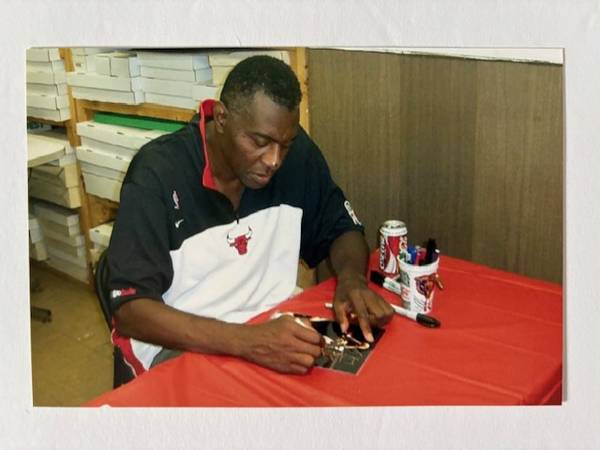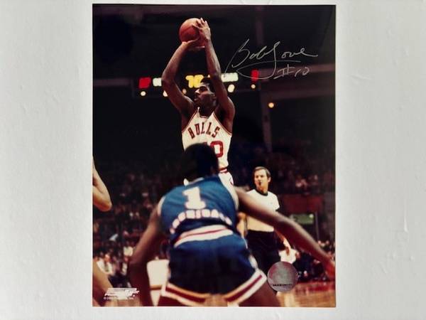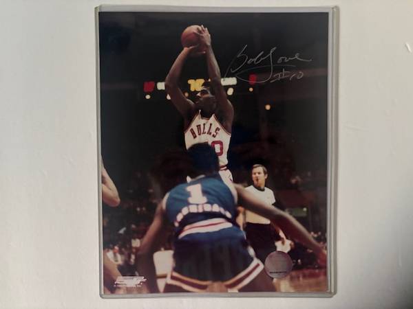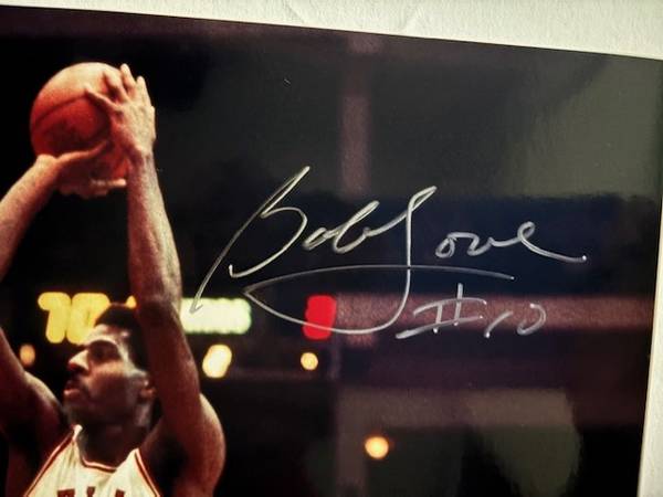 This 8 x 10 photo of the legendary Chicago Bulls player Bob Love is a rare find. The photo is still in excellent condition and comes with a sleeve for protection. The certificate of authenticity is a photo of Love signing the photo to verify the autograph. The autograph is legible. Perfect for any Bulls fan or sports collector. The asking price is $40. Pickup or meetup are both options.
