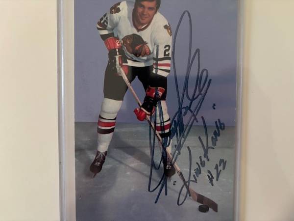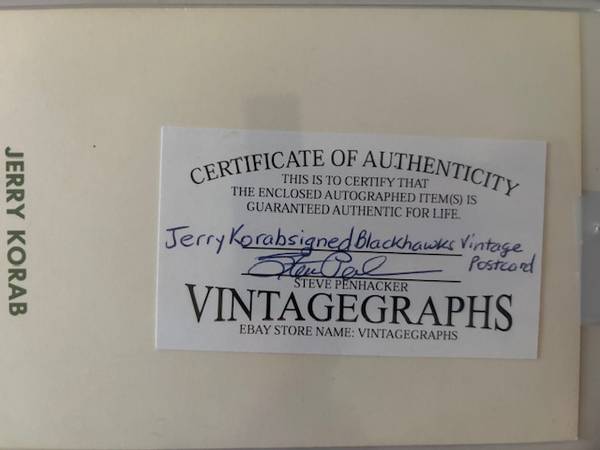 This 4 x 6 photo postcard of the legendary Chicago Blackhawks player Jerry Korab is a rare find. The photo is still in excellent condition and comes with a sleeve for protection. There is a certificate of authenticity to verify the autograph. The autograph is legible. Perfect for any Blackhawks fan or sports collector. The asking price is $30. Pickup or meetup are both options.
