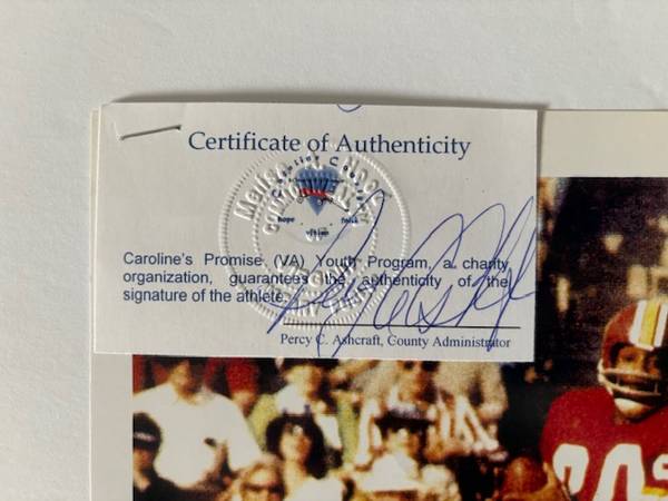 This 8 x 10 photo of the legendary Washington Redskins player Roy Jefferson is a rare find. The photo is still in excellent condition and comes with a sleeve for protection. The certificate of authenticity comes with the photo to verify the autograph. The autograph is legible. Perfect for any Redskins fan or sports collector. The asking price is $30. Pickup or meetup are both options.