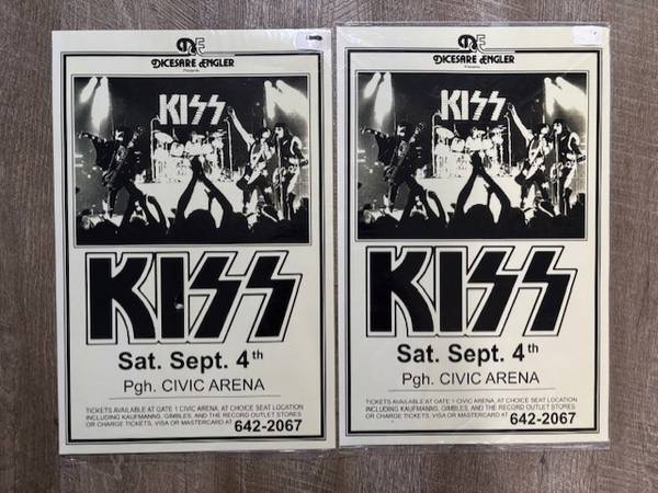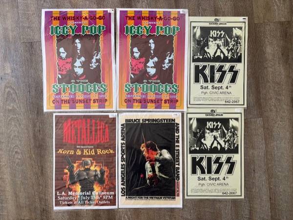 These 12 x 18 and 13 x 20 vintage rock 'n' roll concert posters are a blast from the past. Still in brand new condition and in their original wrapping, these are a rare find for music collectors. The posters feature rock 'n' roll legends Metallica, Bruce Springsteen, Kiss (2 posters) SOLD, and Iggy Pop (2 posters). Perfect for any music room, man cave, or garage. The asking price for each Iggy Pop is $15 and the others are $10. Pickup or meetup are both options.