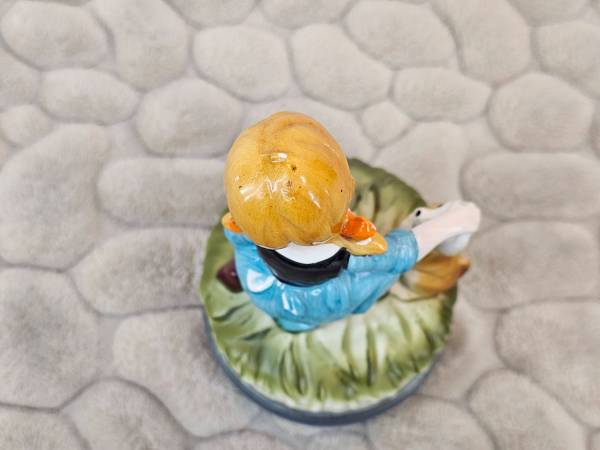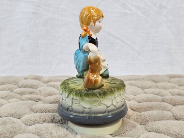 Delightful vintage Little Girl with Her Dog music box made by Artmark is a collectible featuring a ceramic figurine of a young girl with her faithful dog on a base of stone and grass. Crafted in Japan, this music box captures the nostalgic charm and meticulous craftsmanship typical of mid-20th century Japanese ceramics. It plays the iconic song Edelweiss, making it a perfect addition for collectors of both figurines and musical treasures. The music box is in working condition, but plays slow. Perhaps a good cleaning? I see no cracks or chips, but there are some small manufacturing defects (painting) on the head. Overall, really nice vintage condition.