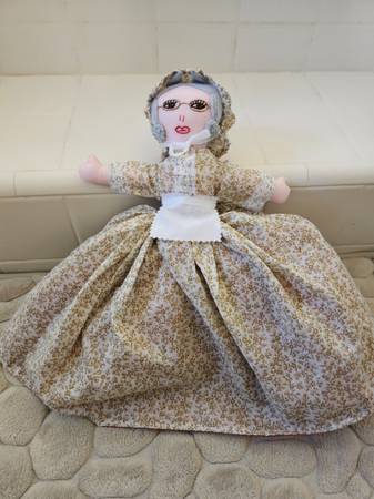 This vintage handmade Little Red Riding Hood rag doll is a collector's item that is sure to delight children and adults alike. The 15-inch doll features a soft body with hand-painted features, including bright blue eyes and golden braided hair (yarn). The doll comes from a vintage product line and is designed to look like characters from the classic tale. This durable and well-crafted doll is suitable for all occasions and makes a great addition to any collection. The unique Topsy Turvey design allows the doll to transform into three different characters: Little Red Riding Hood, the Big Bad Wolf, and Grandma. It's perfect for playtime, display, or as a gift.