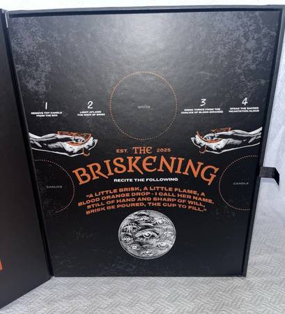 “The Briskening Kit” which includes the following: A Chalice, Brisk Can Candle, Image of the Blood Orange Brisk Bottle, Beanie and Blood Orange Brisk 1L bottle.
