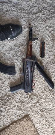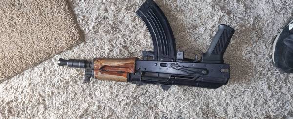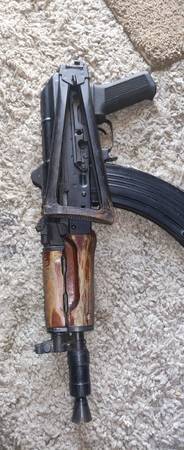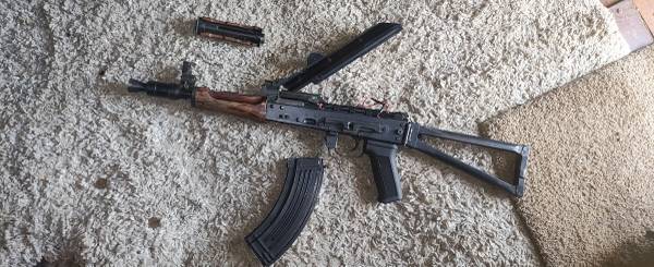 Used, all metal, electric( needs battery and Rc car charger can be bought on Amazon) semi auto and automatic fire, upgraded motor located in the handle real wood from handle member, trigger handle polymer plastic. It shoots soft pellet 6mm bbs . The magazine is metal steal also. Foldable stock and play. It's rare and a collectors piece. Pellets included.