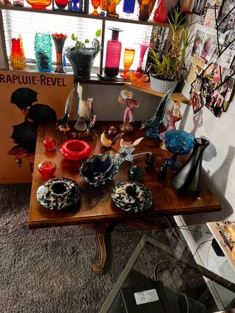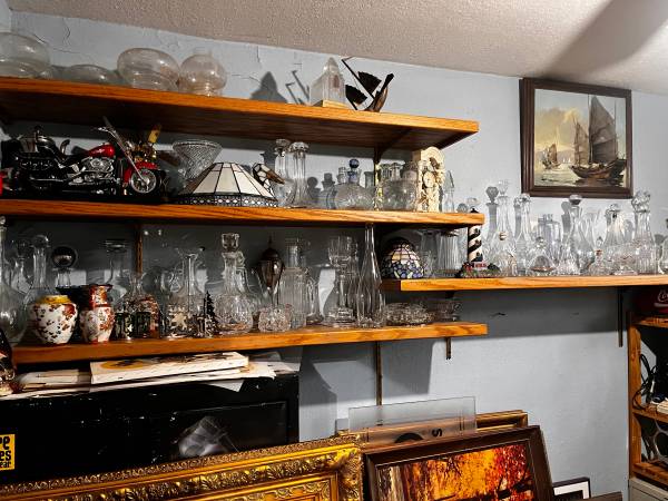 Hundreds of pieces of all hi end makers ,Waterford , lalique, baccarat orrefores murano swavorski . Pieces ranging from birds dogs cats roosters bulls elephants horses dogs flowers and bowls and bar wares Tiffany inkwells custom jellyfish chandelier made of antique crystals you name it I probably have it decanters vases