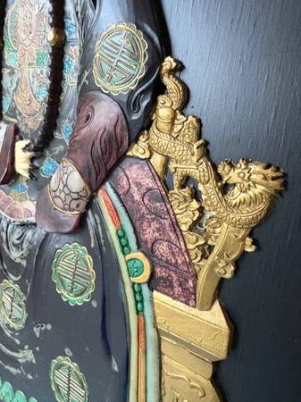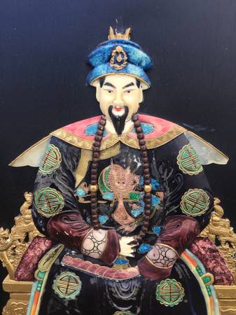 Soap stone with wood frame • Painted by hand • Ready to hang A portrait depicting an 18th century Qing Dynasty emperor, intricately finished with colorful Shou Shan soapstone on a black matte wood
