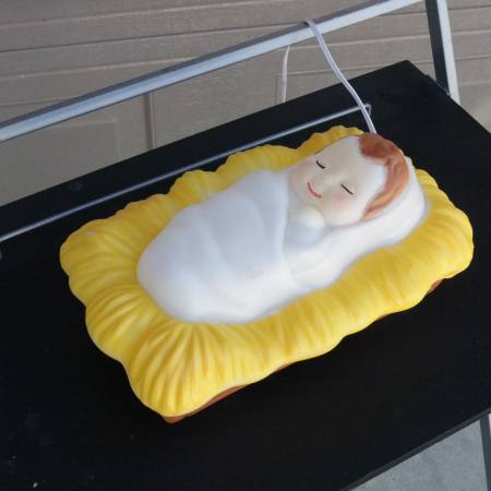 The Empire BLOW MOLD 3 Piece Child Nativity set from 1996 features a large, multicolor plastic Jesus figure that is perfect for indoor and outdoor Christmas displays. This novelty/specialty item stands at 18 inches tall and comes in its original box. The blow mold design and religious theme make it a unique addition to any holiday décor, especially for those looking to showcase their faith during the season. Made in the United States in the 1990s, this vintage piece is a charming reminder of Christmas celebrations past.