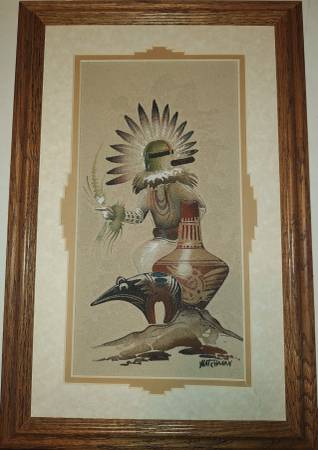 This is a beautiful authentic Native American Navajo sand painting. This beautiful wooden oak framed sand painting can be used in so many ways and makes a great addition to any room. The Navajo Indian artist created a beautiful sand painting with colorful Native American symbols that have been popular for centuries in Navajo tradition. The frame is oak and is very well made.