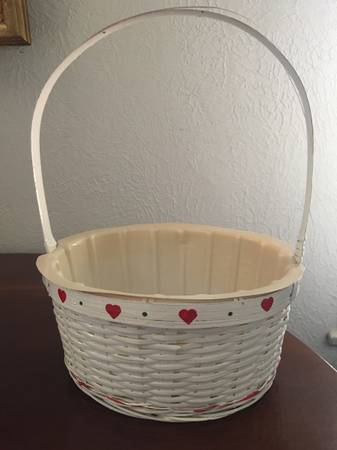 Vintage cream off-white basket with handpainted red heart trim. Has a removable liner so can also be used for a flower pot or plant planter. Would also make a very unique and lovely Easter basket. One of a kind full of love, $30