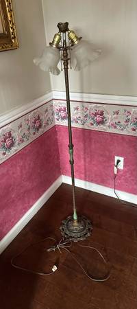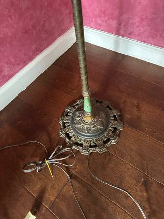 Step back in time with this exquisite vintage floor lamp, a true testament to the elegance of a bygone era. This piece features historical charm with a distinctive ornate durable cast metal base with charming green accents.
