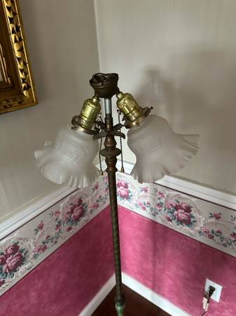 Original condition, good. Lamp shades included but not original. Missing top cap.