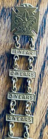 LOT OF 14 VINTAGE BOY SCOUT PIECES. NECKERCHIEF SLIDES (INCLUDING ORDER OF THE ARROW), BELT BUCKLE, 50yr PIN, MEDAL 1/20 10K GP GREEN RIBBON BSA EAGLE FLUER De Lis PIN, COMMUNITY STRIP & MORE....