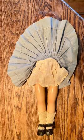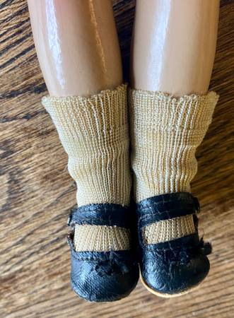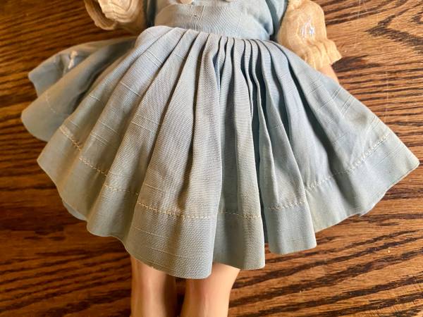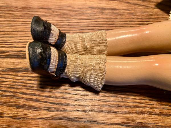 ORIGINAL BLUE PLEATED DRESS WITH ATTACHED SLIP, SHOES AND SOCKS ..AND HER ORIGINAL BLK OILCLOTH BOW TRIMED SHOES AND SOCKS. $50