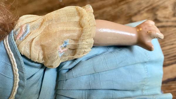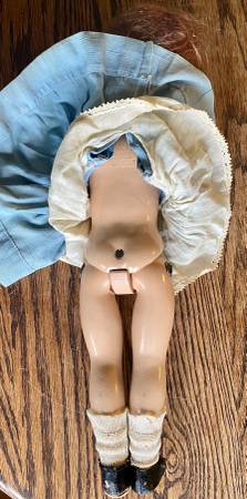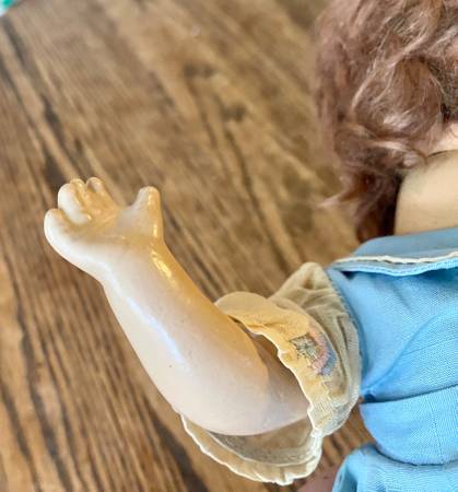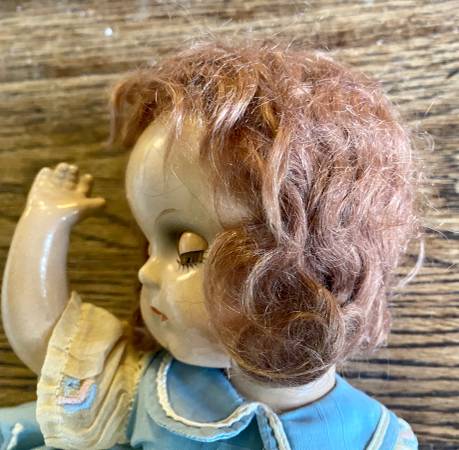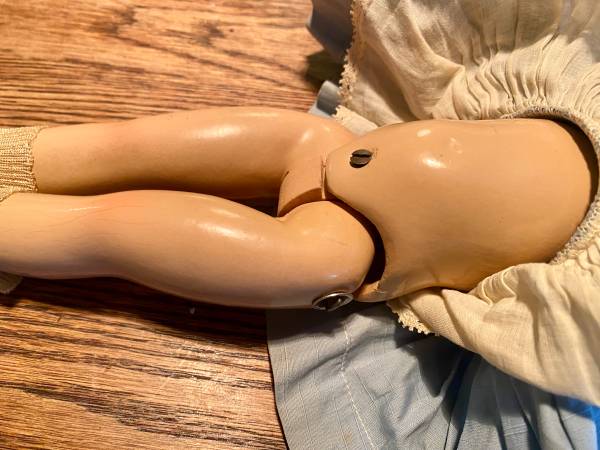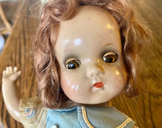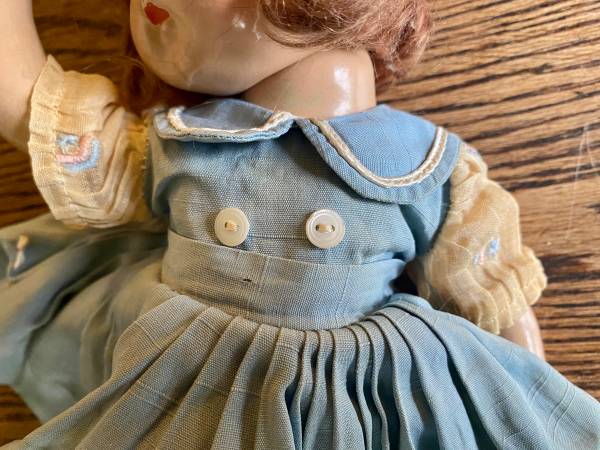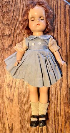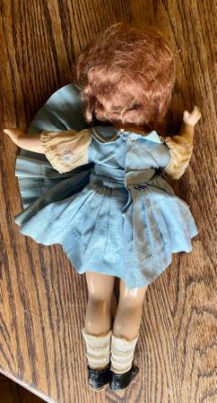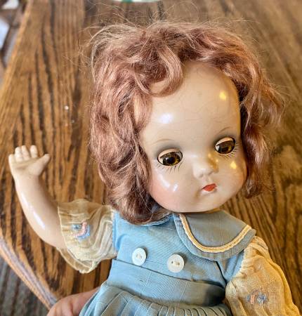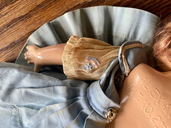 MADAME ALEXANDER COMPOSITION 13 1/2" JEANNIE WALKER DOLL MADE IN ONE YEAR ONLY, 1941. All composition jointed body, brown sleep eyes with real eyelashes, painted lower lashes, closed small puckered mouth, rosy chipmunk cheeks, single stroke eyebrows, human hair light brown wig. Has a unique walking mechanism with pulley and levers, this was Alexander's first walking doll, is fully jointed, doll marked Alexander Doll Co. Pat No. 2171281
