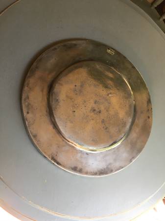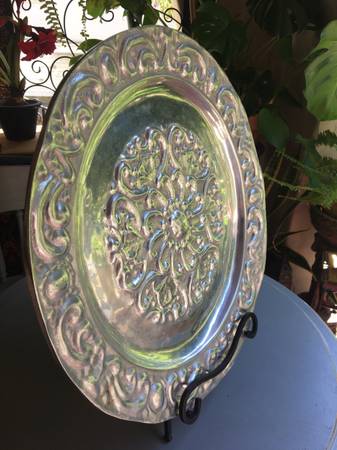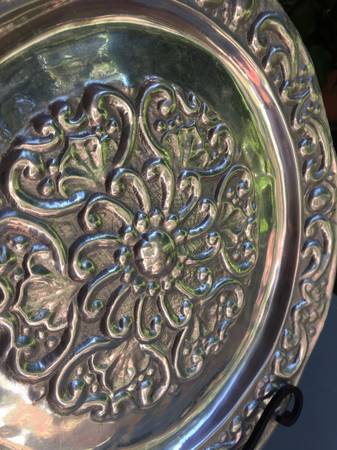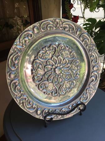Photos 7-12: 16" Round highly carved decorative tray, very thick, high quality Mexican pewter, $195