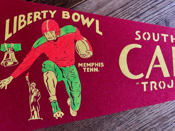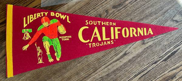 RARE VINTAGE 1975 USC TROJANS LIBERTY BOWL PENNANT MINT CONDITION IN PLASTIC SLEEVE. $70