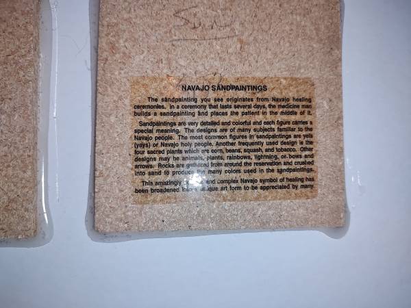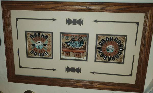 Vintage Navajo Native American Sand Painting in Wood Frame with documentation on back of painting. Three paintings uniquely matte n framed together to create a one of a kind painting. Reduced from...