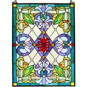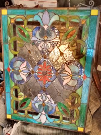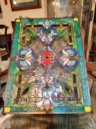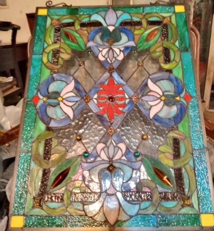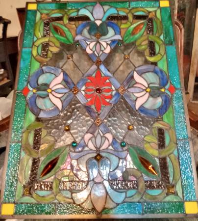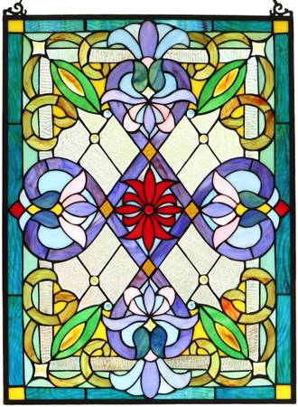 Victorian Tiffany Style Stained Glass Window Panel with Chain, Rectangular Shape, 18" W x 25" H No cracks, no solder issues, just multiple beautiful borders of textured glass, raised decorative...