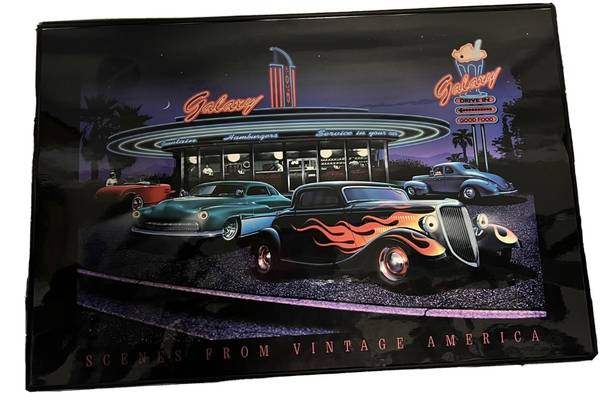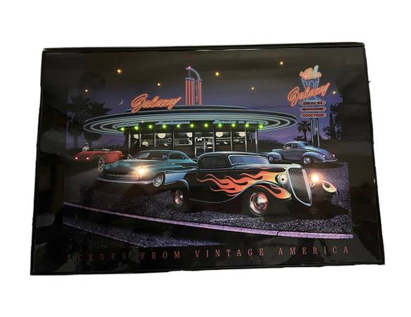 Vintage America Print Picture Wall Hanging Art 1950s Muscle Car Diner Electric Art Las Vegas Lights up, two bulbs out Replaceable Price reflects this