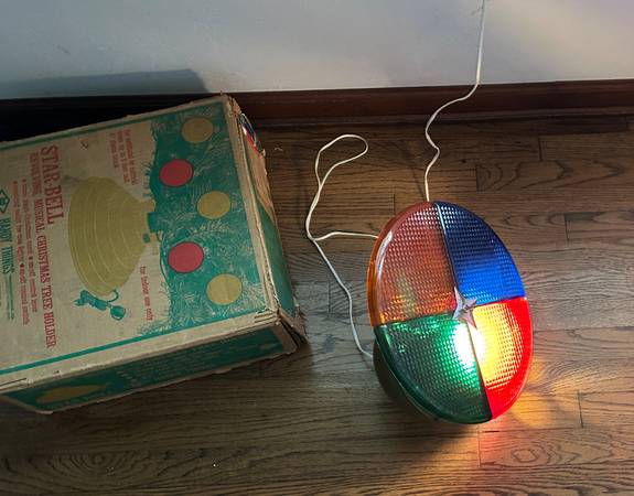 VINTAGE MCM BEAUTIFUL 7 FOOT 105 LIMB SILVER POM POM CHRISTMAS TREE WITH REVOLVING MUSICAL CHRISTMAS TREE HOLDER AND COLOR WHEEL. $800 ALSO MANY MANY HAND BLOWN ORNAMENTS THAT HAVE BEEN COLLECTED...