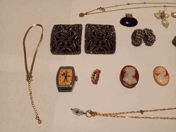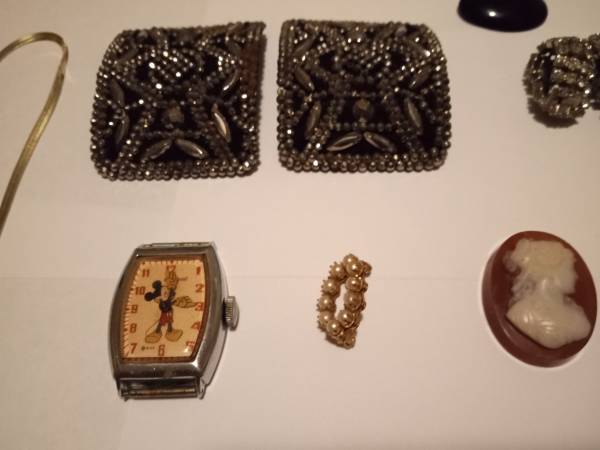 This is a very nice collection of vintage costume jewelry from the 1950's to the 1970's. There are earrings, necklaces, brooch, a 1958 Mickey Mouse watch, and bracelets. The Mickey Mouse watch hands turn manually, but the watch needs some work to run properly. All in all a very nice and interesting collection of jewelry.
