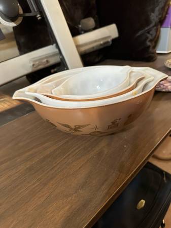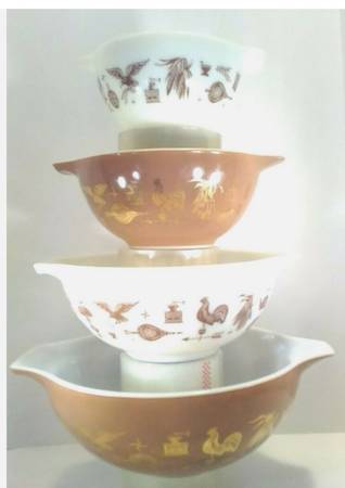 Vintage Pyrex Early American Cinderella mixing bowl set Set of 3 vintage Pyrex mixing bowls. Colors, 441 & 444, brown and white. In excellent condition. Cash Only