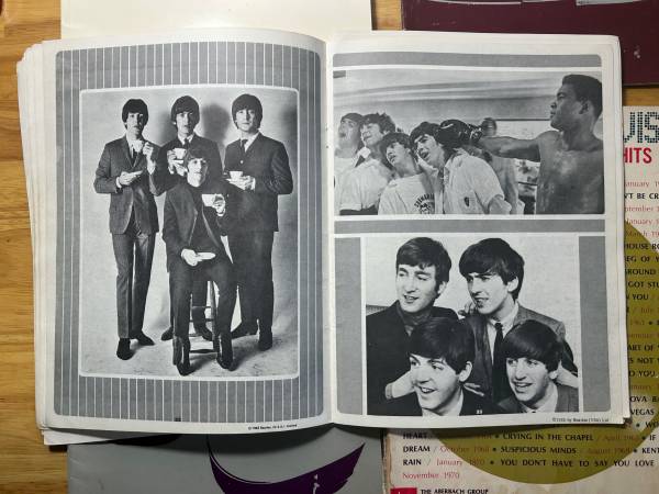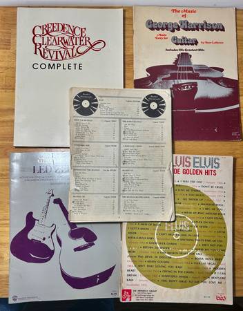 VINTAGE SHEET MUSIC. GUITAR STYLES OF LED ZEPPELIN 1983. RARE BEATLES DISCOGRAPHY 9 ALBUMS 1965 WITH PHOTOS (COVER PAGE IS SHOWS WARE BE OVER ALL IS IN VERY GOOD CONDITION). ELVIS 45 WORLD WIDE GOLDEN HITS 1970, 120 PAGES. GEORGE HARRISON 1980, 32 PAGES. CREEDENCE CLEARWATER REVIVAL COMPLETE 171 PAGES. ALL FOR $70