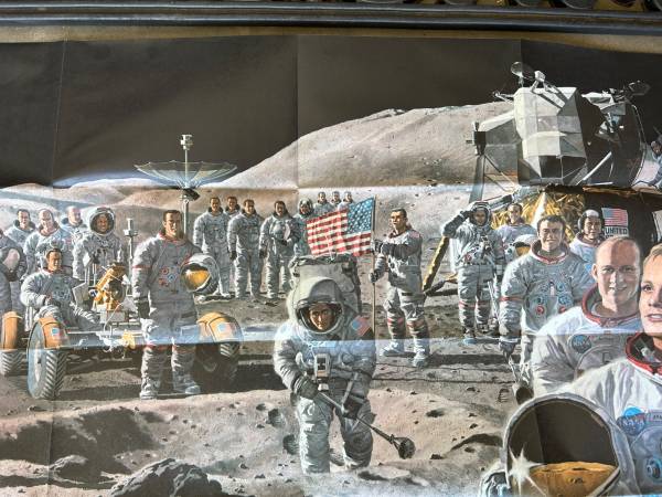 Original poster from a 1973 issue of National Geographic magazine, celebrating the historic Apollo missions from the first Apollo test crew through Apollo 17. Titled "Teammates in mankind's greatest adventure," the poster is a composite of Apollo astronauts, standing on the surface of the moon, with a waving American flag.