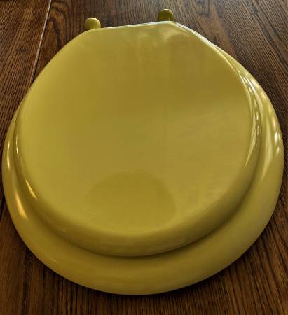 VINTAGE NEW OLD STOCK RETRO 1906s CANARY YELLOW TOILET SEAT. UNUSED. 17" L0NG, 15" WIDE. MY CAMERA WASN'T ABLE TO CAPTURE THE BRILLIANT COLOR OF THE SEAT. $50