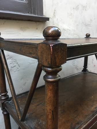 Note carved wood posts, cannonball accents and criss cross bars at either end to keep items from sliding off. Simple yet elegant form with a touch of California mission or ranch styling.