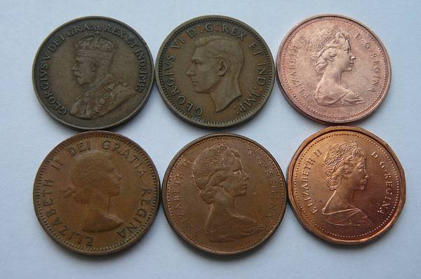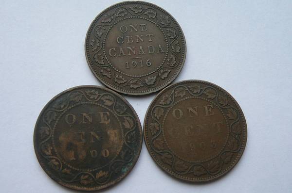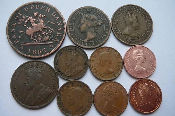 Here are ten different Canada coins with different monarchs. Included are 1852 One Penny Bank token. These are large half dollar size and were minted before regular Canada coinage was begun in 1858, 1900 Queen Victoria Large cent size of quarter, 1903 Edward VII Large cent, 1916 George V Large cent, 1920 George V Small cent, 1940 George VI small cent, 1954 Queen Elizabeth cent, 1967 100th anniversary Queen Elizabeth cent, 1979 New head Queen Elizabeth cent, and last is 1985 Zinc Queen Elizabeth cent. These go through a lot of history and would be great for a person from Canada to have. These are well worth the price just for the 1852 Canada Bank token. You get all ten for $20.