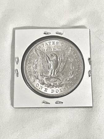 About uncirculated-AU(50) 1897-P Morgan silver dollar. Valued at $72 on US Coin book.