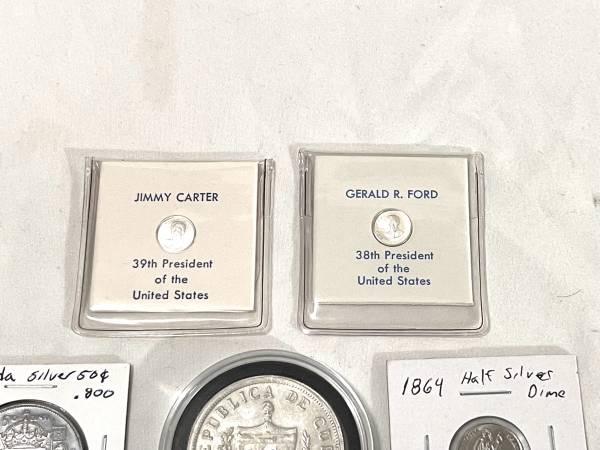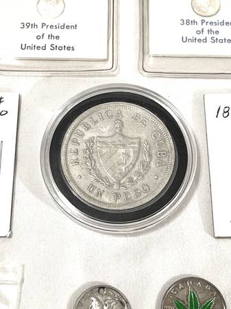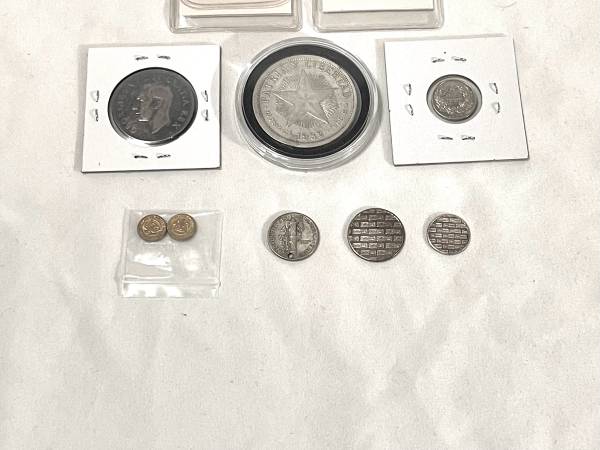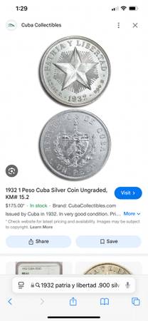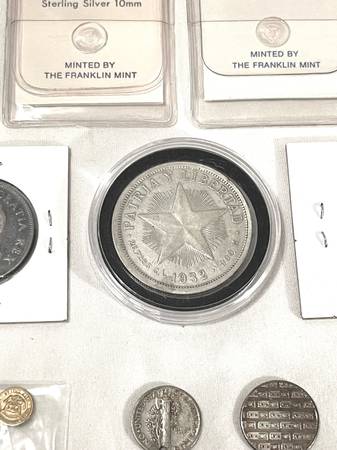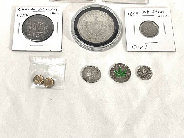1932 Cuba, silver Coin , 1950 Canada, silver coin and another very collectible silver coins .925 some are .900 some are .800. In some are .999 fine silver. The Cuba serve a coin valued at $175. The Canada silver Coin is valued at $45-$60 depending on the condition. Other coins are valued at $75. I’ll accept $175 for everything which is a deal.