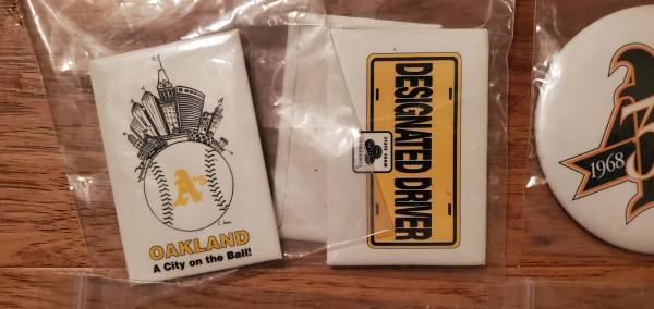 For sale- I have a mixed set of 8 Oakland Athletics buttons from the early 1990's etc. Please see pictures for exact description. Some show signs of wear on the backs. Not looking to separate, sold as a set! $15 Pick up in vacaville. Willing to ship for additional cost with buyer paying shipping costs with their zip code. Contact me with any questions. I have other A's memorabilia too. Thanks for looking.