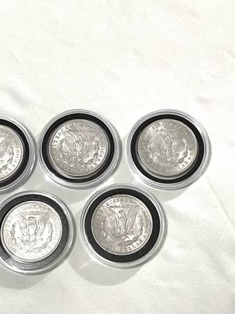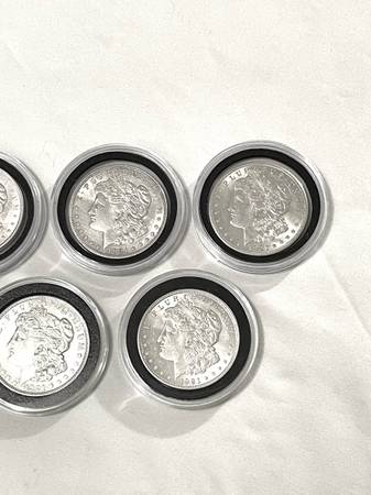 Seal sealed in capsules (5) About Uncirculated-AU(5) 1921 Morgan silver dollars. These are valued at $74 each on US Coin book in this condition. I’ll accept $65 each. $325 for all five.