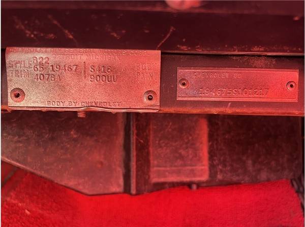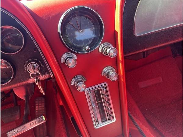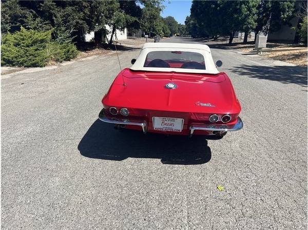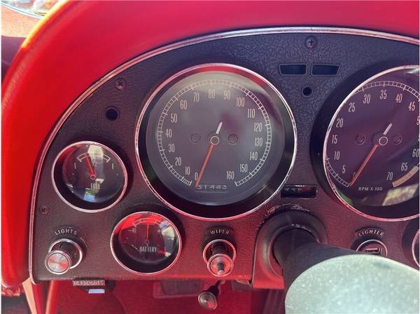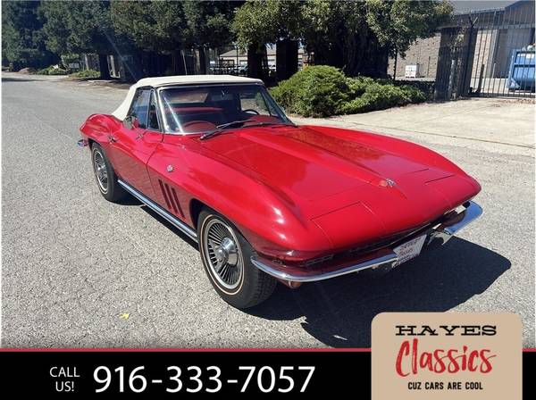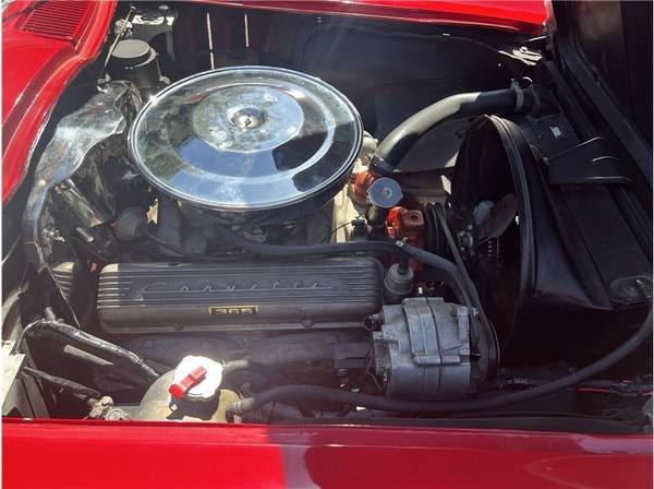 31k Miles Shown 327ci V8 Four-Speed Manual Transmission Red Paint White Soft Top Red Vinyl Upholstery 15? Cast Aluminum Wheels AM/FM Radio his 1965 Chevrolet Corvette is a red-on-red convertible that is powered by a replacement 327ci V8 paired with a four-speed manual transmission. It is fitted with a white soft top, 15? cast aluminum wheels, four-wheel disc brakes, chrome bumpers, retractable headlights, and an AM/FM radio